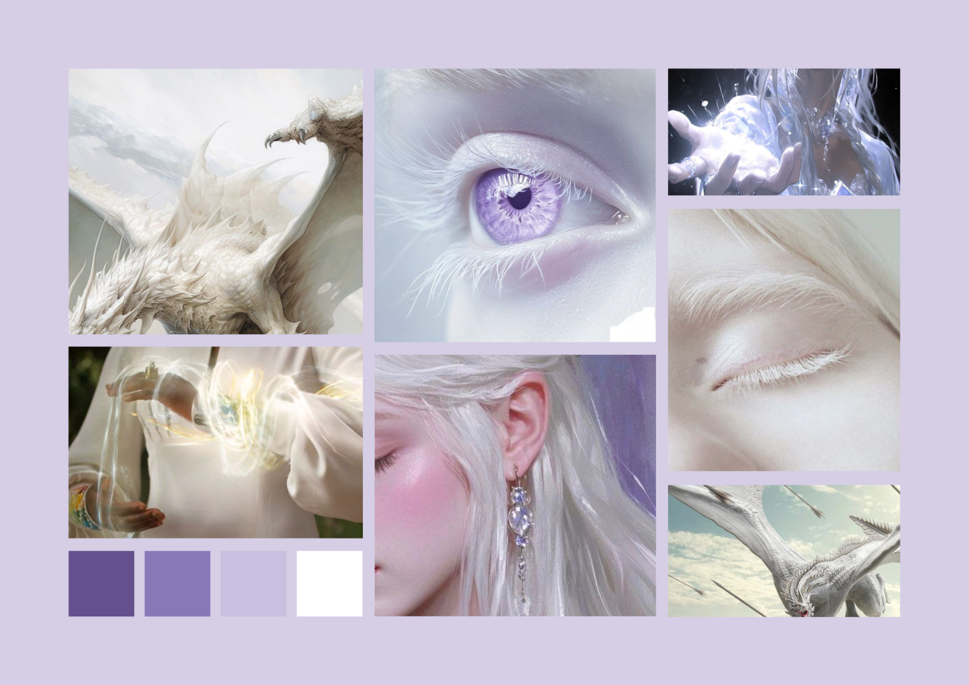 Aparência: Cabelos prateados, pele branca, olhos lilás ou violeta.