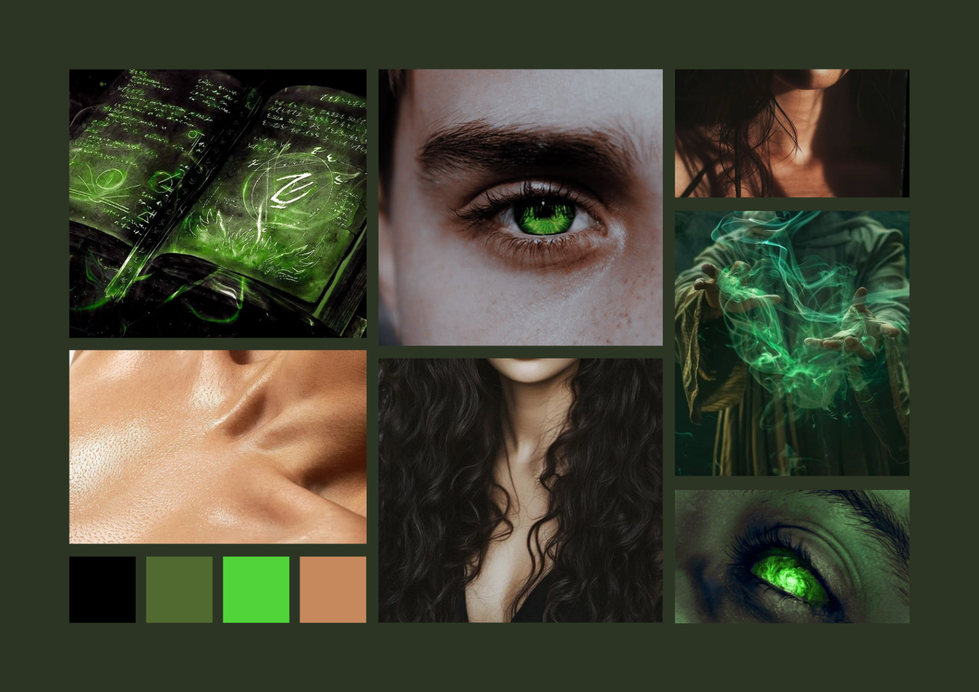 Aparência: Cabelos pretos, pele oliva, olhos verde esmeralda.