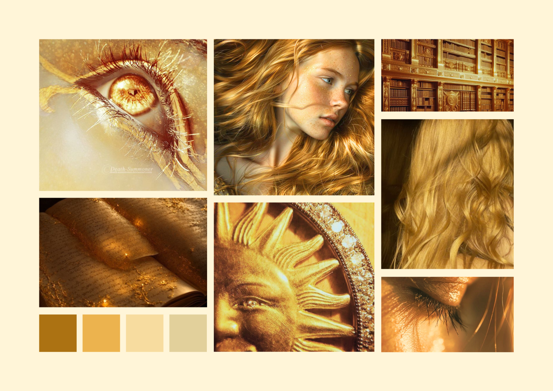 Aparência: Cabelos loiros dourados, olhos dourados, pele dourada.